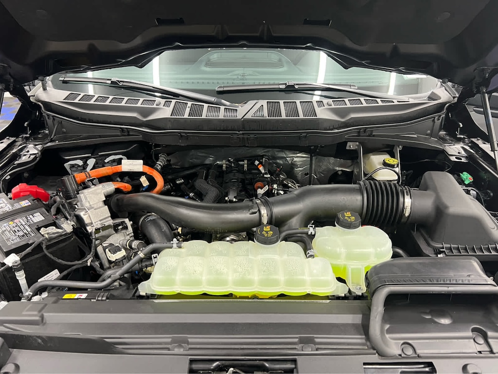 EQUIPMENT GROUP 303A HIGH Chrome Door & Tailgate Handles, Power-Adjustable Pedals, Wrapped Steering Wheel, Connected Navigation, 1-year trial, Navigation services require SYNC4 and FordPass Connect (optional on select vehicles), complimentary connect service and the FordPass app (see FordPass terms for details), Eligible vehicles receive a complimentary 1-year trial of navigation services that begins on the new vehicle warranty start date, Customers must unlock the navigation service trial by activating the eligible vehicle w/a FordPass member account, If not subscribed by the end of the complimentary period, the connected navigation service will revert to a moving-map and active routing will no longer be available, Connected service and features depend on compatible AT&T network, ENGINE: 3.5L POWERBOOST FULL-HYBRID V6 Pro Power Onboard 2.4KW and removes 36 gallon fuel tank, GVWR: 7,400 lbs Payload Package, Electronic Locking w/3.73 Axle Ratio, XLT BLACK APPEARANCE PACKAGE PLUS Black Grille, Gray Box Side Decal, Black Exterior Badging, 6 Black Running Boards, Wheels: 20 Gloss Black Painted Aluminum, Tires: 275/60R20 BSW Automatic Transmission, Body-Color Front & Rear Bumpers, Dual Exhaust w/Black Tips, Dark Interior Appliques, Floor Shifter, TWIN PANEL MOONROOF, BED UTILITY PACKAGE Tailgate Step w/Tailgate Work Surface, LED Box Lighting, 4 Pickup Box Tie-Down Plates, TRAY STYLE FLOOR LINER W/CARPET MATS.