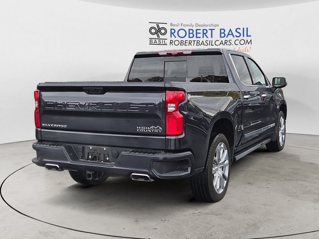 CARFAX One-Owner. Dark Ash Metallic 2023 Chevrolet Silverado 1500 High Country 4WD 10-Speed Automatic EcoTec3 6.2L V8 10-Speed Automatic, 4WD, Jet Black/Nightshift Blue Leather, 10-Way Power Driver Seat w/Lumbar, 10-Way Power Passenger Seat Adjuster w/Lumbar, 12.3" Multicolor Reconfigurable Digital Display, 120-Volt Bed Mounted Power Outlet, 120-Volt Instrument Panel Power Outlet, 15" Diagonal Multicolor Head-Up Display, 2 USB Data Ports, 2nd Row Heated Outboard Seats, Adaptive Cruise Control, All-Weather Floor Liner (LPO), Auto-Dimming Inside Rear-View Mirror, Auto-Locking Rear Differential, Bed View Camera, Bluetooth® For Phone, Body-Color Painted Mirror Caps, Chevrolet Connected Access Capable, Chevytec Spray-On Black Bedliner, Chrome Assist Steps, Chrome Recovery Hooks, Color-Keyed Carpeting Floor Covering, Compass, Deep-Tinted Glass, Driver Memory, Dual Exhaust w/Polished Outlets, Dual Rear USB Ports (Charge Only), Electric Rear-Window Defogger, Electrical Steering Column Lock, Electronic Cruise Control, Floor Mounted Center Console, Front Carpeted Floor Mats, Front LED Fog Lamps, Front Rainsensing Wipers, HD Surround Vision, Heated Driver & Front Outboard Passenger Seats, Heated Steering Wheel, High Capacity Suspension Package, High Country Premium Package, Hitch Guidance, Hitch Guidance w/Hitch View, Integrated Trailer Brake Controller, Keyless Open & Start, LED Cargo Area Lighting, OnStar & Chevrolet Connected Services Capable, Outside Heated Power-Adjustable Mirrors, Perimeter Lighting, Power Front Passenger Windows w/Express Up/Down, Power Front Windows w/Driver Express Up/Down, Power Rear Windows w/Express Down, Power Sliding Rear Window w/Rear Defogger, Power Sunroof, Power Tailgate, Power Tilt & Telescoping Steering Column, Preferred Equipment Group 3LZ, Rear Camera Mirror, Rear Carpeted Floor Mats, Rear Cross Traffic Alert-Braking, Rear Pedestrian Alert, Rear Wheelhouse Liners, Remote Vehicle Starter System, Safety Alert Seat, SiriusXM w/360L, Standard Tailgate, Steering Wheel Audio Controls, Technology Package, Theft Deterrent System (Unauthorized Entry), Trailer Camera Provisions, Trailer Side Blind Zone Alert, Trailering App, Trailering Package, Ultrasonic Front & Rear Park Assist, Universal Home Remote, Up-Level Rear Seat w/Storage Package, Ventilated Driver & Front Passenger Seats, Wheels: 22" x 9" Painted Aluminum, Wi-Fi Hot Spot Capable, Wireless Charging, Wireless Phone Projection, Wrapped Steering Wheel.