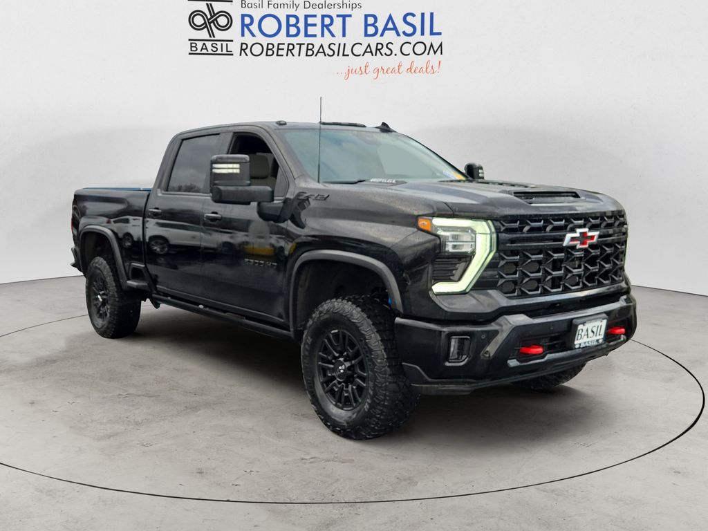 CARFAX One-Owner. Clean CARFAX. Black 2025 Chevrolet Silverado 2500HD ZR2 4WD 10-Speed Automatic 6.6L V8 10-Speed Automatic, 4WD, Jet Black/Graystone Leather, 120-Volt Bed Mounted Power Outlet, 120-Volt Interior Power Outlet, 15" Diagonal Multicolor Head-Up Display, 170 Amp Alternator, 220 Amp Alternator, 3.73 Rear Axle Ratio, Adaptive Cruise Control, All-Weather Floor Liners, Auto-Dimming Inside Rear-View Mirror, Bed View Camera with Two Trailer Camera Provisions, Black Chevytec Spray-on Bedliner, Bluetooth® For Phone, Chevrolet Connected Access Capable, Color-Keyed Carpeting Floor Covering, Compass, Deep-Tinted Glass, Durabed Pickup Bed, Electric Rear-Window Defogger, Electronic Cruise Control with Set and Resume Speed, Front Bucket Seats, Front LED Fog Lamps, Front Rain-Sensing Wipers, Heated 2nd Row Outboard Seats, Heated Steering Wheel, High Gloss Black Mirror Caps, Hitch Guidance with Hitch View, in-Vehicle Trailering App System, Keyless Open and Start, LED Cargo Area Lighting, LED Smoked Amber Roof Marker Lamps, Manual Tilt and Telescoping Steering Column, OnStar Services Capable, Perforated Leather Seat Trim, Power Door Locks, Power Front Windows with Driver Express Up/Down, Power Front Windows with Passenger Express Up/Down, Power Rear Windows with Express Down, Power Sliding Rear Window with Defogger, Power Up/Down Tailgate Function with Power Lock and Release, Preferred Equipment Group 3LT, Push Button Start, Rear Camera Mirror, Rear Cross Traffic Alert, Rear Wheelhouse Liners, Remote Vehicle Starter System, SiriusXM with 360L Trial Subscription, Snow Plow Prep/Camper Package, Standard Tailgate, Steering Wheel Audio Controls, Technology Package, Trailer Camera Provisions, Ultrasonic Front and Rear Park Assist, Unauthorized Entry Theft-Deterrent System, Universal Home Remote, Up-Level Rear Seat with Storage Package, Wi-Fi Hotspot Capable, Wireless Charging, Wireless Phone Projection, Wrapped Steering Wheel.