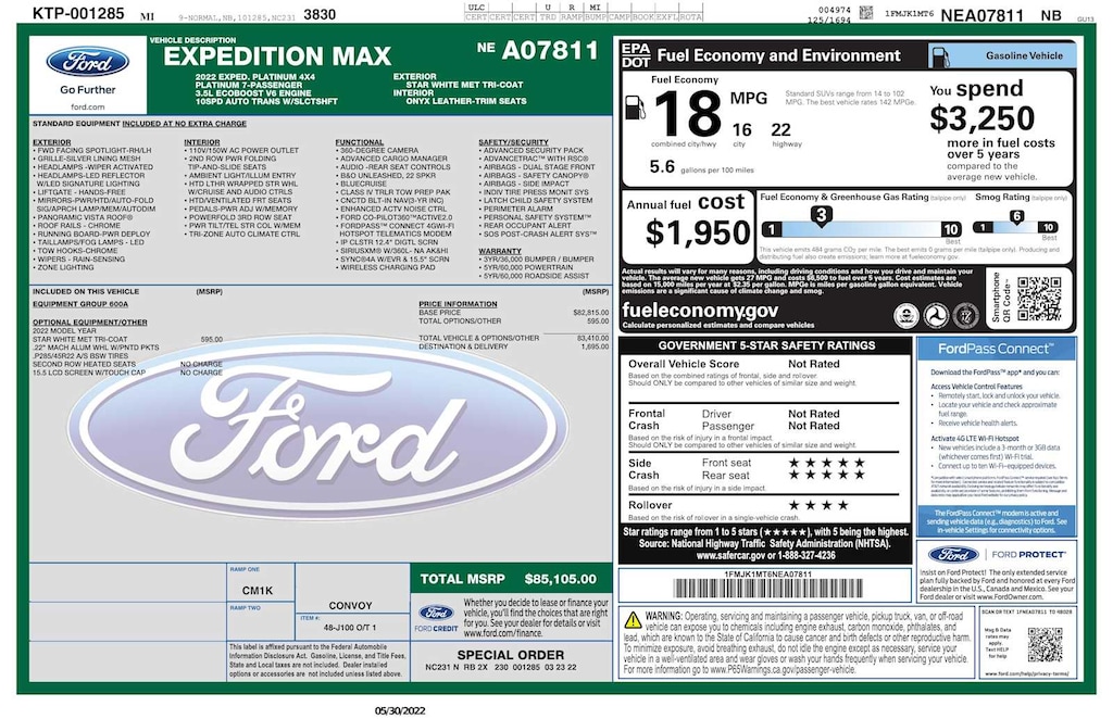Leather Seats, Third Row Seat, Navigation, Sunroof, Panoramic Roof Non-Smoker vehicle Ford Platinum with Star White Metallic Tri-Coat exterior and Black Onyx interior features a V6 Cylinder Engine with 400 HP at 5000 RPM*.
